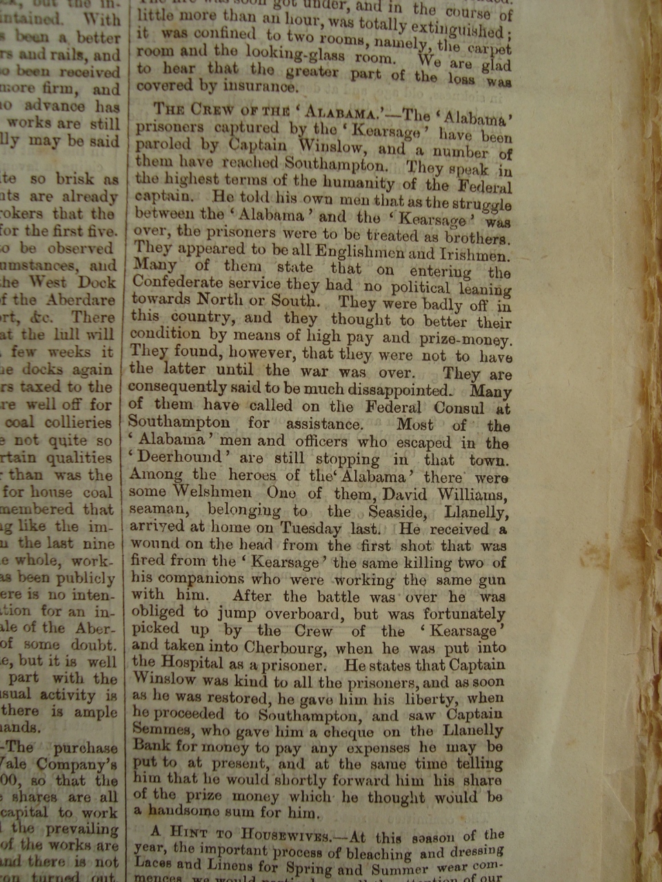 In Britannia’s Dragon, I gave an account of the Welshmen who served in both the Union and Confederate Navies during the American Civil War, I knew that the names I mentioned there were likely to be only a relatively small number of those who actually fought, and in recent days another example has come to light. This was David Williams of Llanelli, who provided the following previously unknown first hand account of the last fight of the Alabama and its aftermath, together with an insight into the motives that drove British volunteers to serve in the war. I am trying to discover further information about Williams and his previous and subsequent histories, but unfortunately, it was a very common name in both Llanelli and Wales as a whole! Having said that, ‘David’ Williams might be synonymous with the ‘Samuel’ Williams, a fireman and known Welshman whom I named in my book and who appears in the list of wounded from the Alabama; I have not had a chance to check the likes of William Marvel’s book, The Alabama and the Kearsarge: The Sailor’s Civil War, which apparently provides detailed biographical information on the crew, so I would be grateful to receive further information from the many students of the Civil War navies.